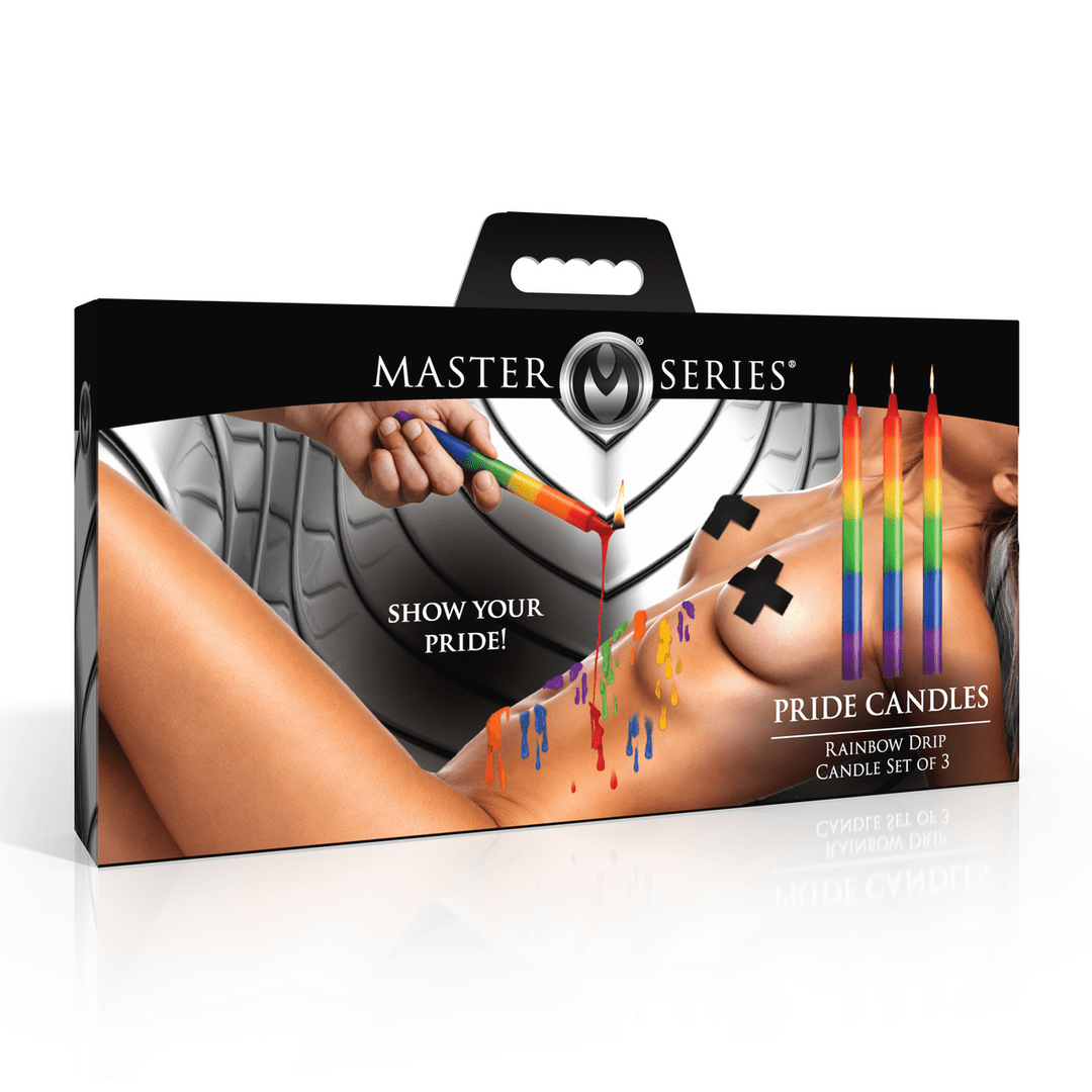 Transform your steamy scenes together and queer them up with our Pride Rainbow Drip Candles! Each of the three candles are layered with vibrant colors that display the full spectrum of the rainbow. These unscented wax play candles are perfect for adding a touch of visual excitement and temperature play.  As you drip the smooth, hot wax on your skin or your partner’s.  You’ll experience the stunning transition of colors along with the pleasing sensation of hot wax! These candles not only provide a kinky sensation but also create stunning body-art to share and admire. Ideal for those sensitive to perfumes. Light the candle to set the mood and let it burn.  Moisturize afterward to keep your skin happy. Measurements: Candles are 7.6 inches x 0.6 inches x 0.6 inches. Burn time: Approximately 1.5-2 hours. Materials: Soy and paraffin wax. Melting temperature: 118°-126° F (48°-52Ëš C). Color: Rainbow.