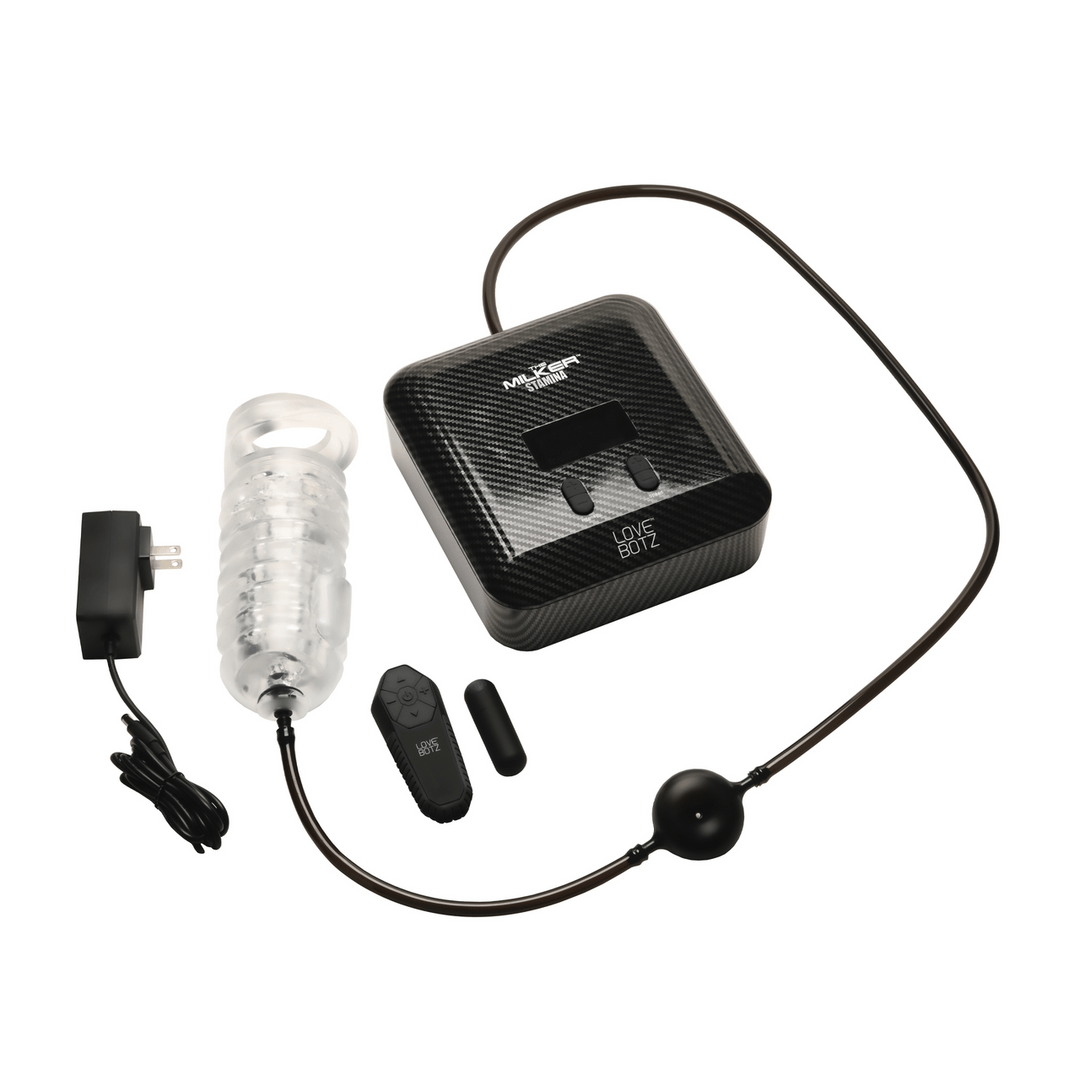 Want to dive into hours of pleasure and increase your sexual stamina? This Milker Stamina is for you! You deserve hands-free pleasure that builds in ecstasy, and keeps you right on the edge while training you for long nights of passion! With the intense Milker Stamina device, you can enhance your pleasure with our advanced automatic milker, engineered for the ultimate indulgence. This sophisticated device includes a TPE sleeve with a securing ring that wraps around the balls and acts as a C-ring, plus a powerful rechargeable bullet that vibrates in 3 speeds and 7 patterns and slips into a pocket on the side of the sleeve. Choose from 5 speeds and 5 suction patterns for a mindblowing experience with settings that are easily adjusted using the large blue buttoms on the device or via the battery-operated, remote. See what setting you’re exploring and easily read the bright, LED display. The 46-inch hose, fitted with a circular valve, prevents fluid ingress into the machine. Ideal for globetrotters, it comes with a power adapter and interchangeable plugs for US, UK, EU, and AUS compatibility. Your partner has been on your mind all day. The way they move, the way they kiss you, that thing they do with thier tongue… But when it comes to seeing them, you never can seem to last long. However, like any good athlete, you know how to train! You find time alone and set out for your first stamina building session. You squeeze the lube into the shaft and slide your rod inside. It feels cool at first, and then warms to your body. The strap wraps around your balls and you feel the blood pulsing through your shaft. As you turn on the bullet vibe to pair it with the remote, you feel yourself twitchig with anticipation and excitement. Then, the suction begins. The slow-at-first, methodical, pulsing and sucking… not giving you what you want, but teasing you little by little. You quiver, your body tense, as you ride the edge as long as you can before your body takes over and releases that pressure! You grunt and moan in pleasure and then, look at the time and realize you’ve lasted longer than you ever have before. Measurements: Machine: 7.4 inches x 6.9 inches x 2.9 inches. Hose length: 46.5 inches. Stroker: 5.8 inches x 2.8 inches. Stroker inner diameter (unstretched): 1 inch. Bullet: 2.4 inches x 0.75 inches. Suction power: 1st speed: .025 mpa / 3.6 psi 2nd speed: .05 mpa / 7.3 psi 3rd speed: .07 mpa / 10.2 psi 4th speed: .09 mpa / 13.1 psi 5th speed: 1 mpa / 14.5 psi. Note: Remote distance up to 32 feet requires one AAA battery (not included).